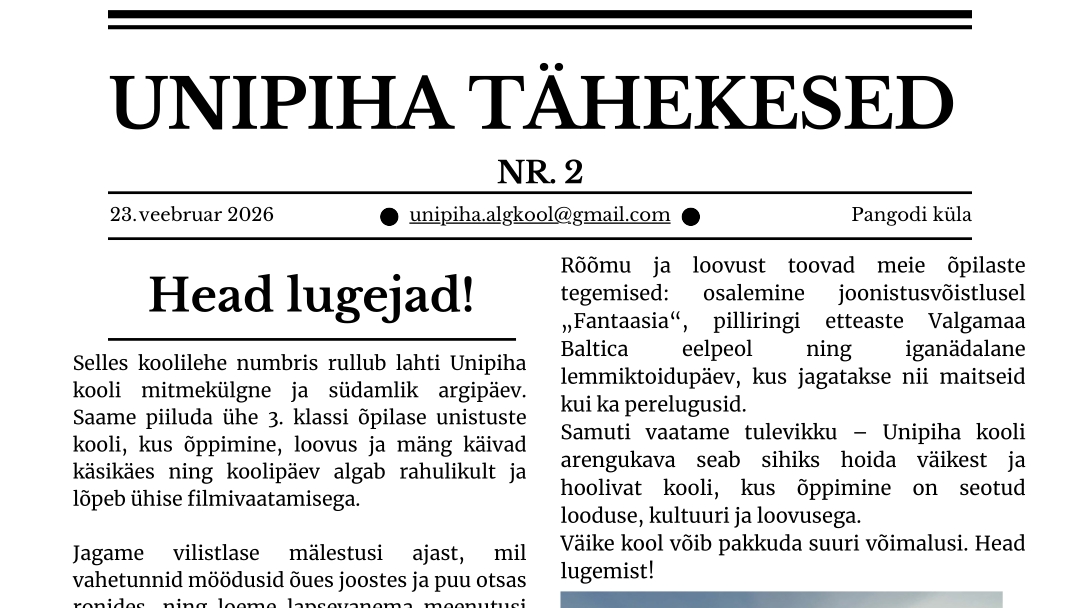 Uudised Ilmus Unipiha Tähekeste teine number . - 19.02.2026 Selles koolilehe numbris rullub lahti Unipiha kooli mitmekülgne ja südamlik argipäev. Saame piiluda ühe 3. klassi õpilase unistuste kooli, kus õppimine, loovus ja mäng käivad käsikäes ning koolipäev algab rahulikult ja lõpeb ühise filmivaatamisega. Loe lehte