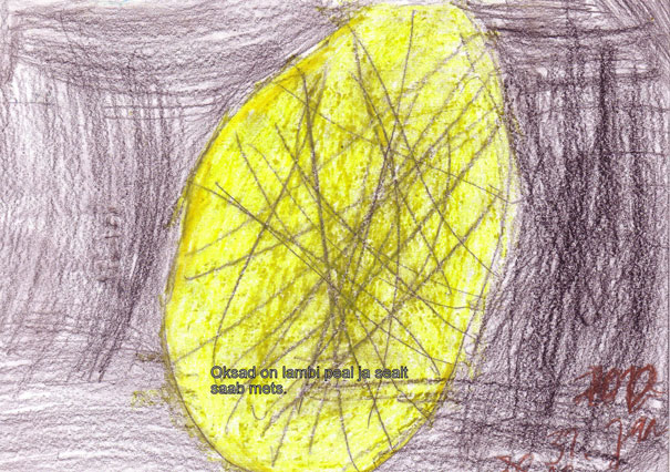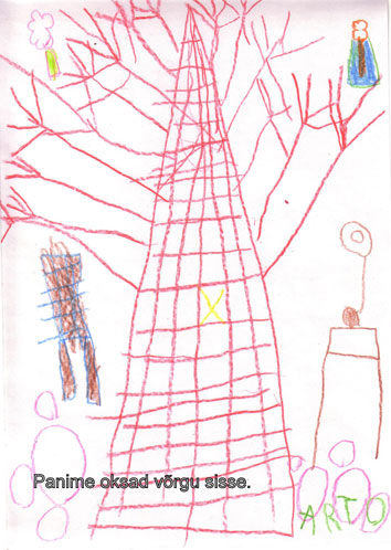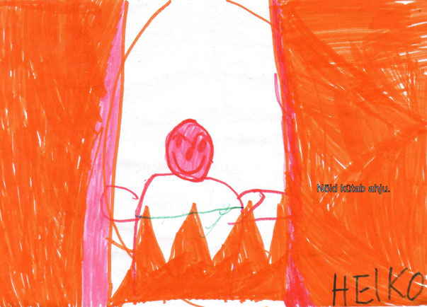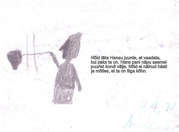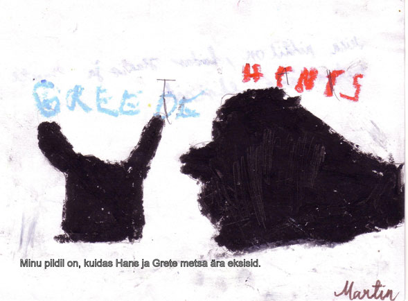 2. veerandi alguses käisime Tartu Uues Teatris vaatamas imelist teatrimängu “Hans ja Grete”. Tavapärase toolis istumise asemel kutsuti lapsed kaasa elama ja tegutsema näitlejate lähedale põrandapatjadele. Kristel Leesmend ja Siim Angerpikk lõid kahekesi maailma, mis oli täiesti erinev seninähtust. Kaasa mängis kõik: lagi, seinad, põrand – ja seda paari lambi, käte, okste ja lehviku kaasabil. Valgus, vari, erinevad mustrid ja hääled ning vana tuntud muinasjutt elustus……Meie lapsed joonistasid ja kirjutasid samal päeval oma muljeid. Siin need on.