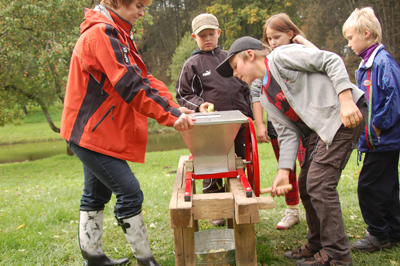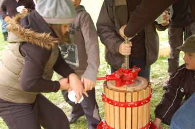 Kui kastid täis, algab õunte pesemine, lõikumine ja käsitsi purustamine. Edasi rändab õunapuder mahlapressi. Ning siis.. „Keele viib alla,“ kiidab Taavi (4.kl.), kui mahalatopsil põhi paistma hakkab. „Poole parem kui poe oma,“ lisavad teised omalt poolt ning võtavad uue topsitäie mahla.