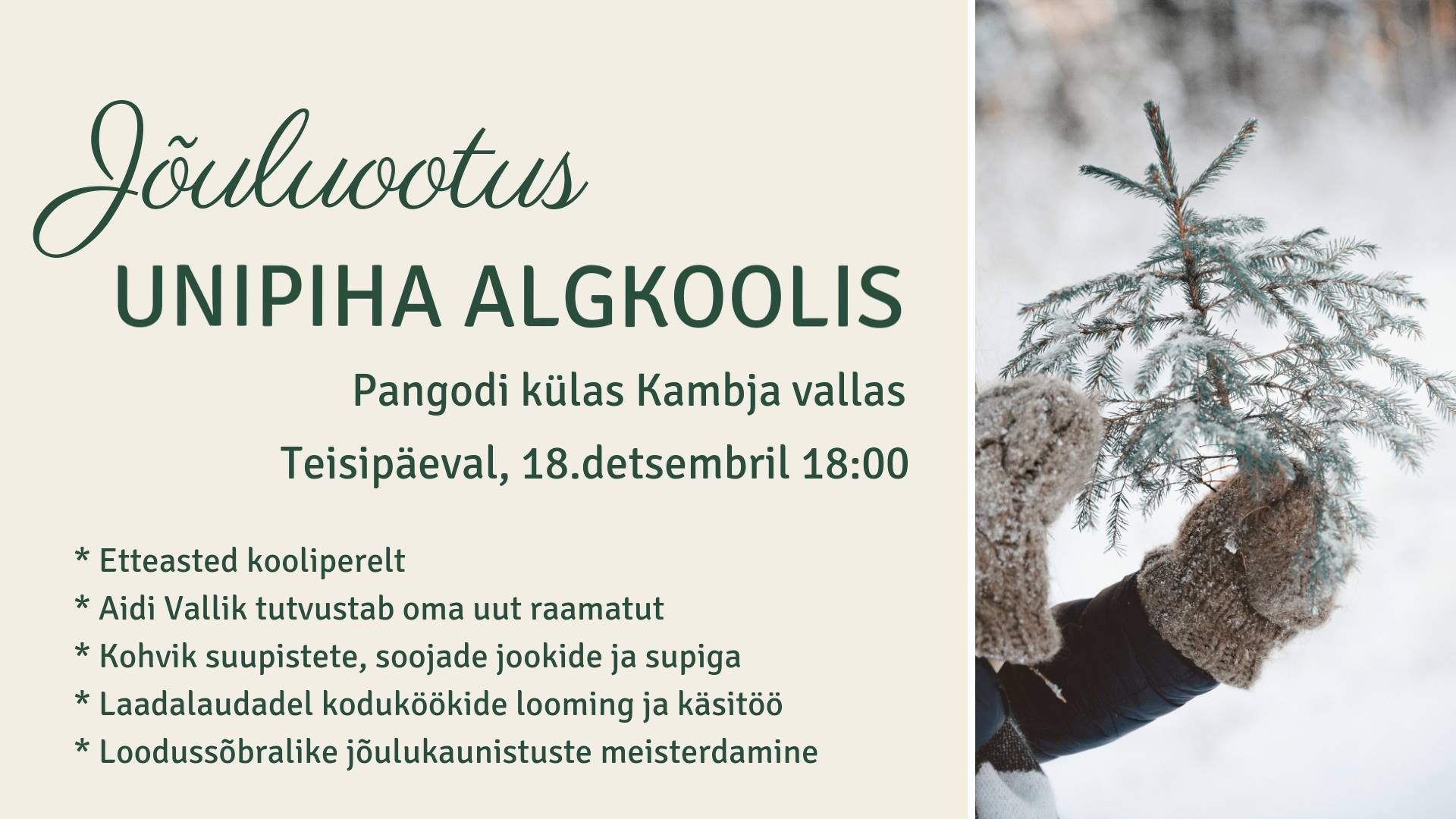 Tulge meile külla! Ootame teid Unipiha Algkoolis Tartumaal Kambja vallas kauni Pangodi järve kaldal teisipäeval, 18. detsembril kell 18:00